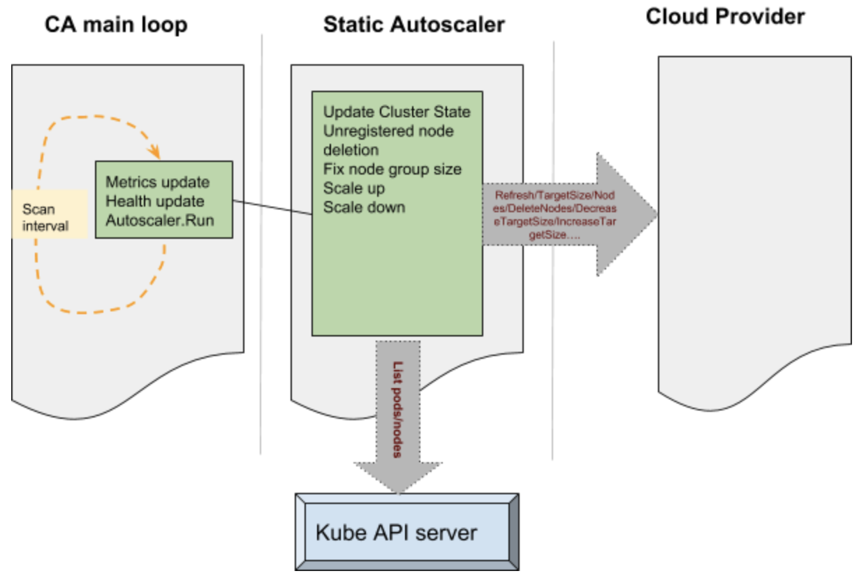 Various operations performed by the CA to manage the state of the cluster is passed onto the cloud provider component. Some examples like - increase target size, decrease target size etc, results in the cloud provider component talking to the cloud services internally and performing operations such as adding a node or deleting a node. These operations are performed on group of nodes in the cluster. The static autoscaler also keeps tab on the state of the system by querying the API server - operations such as list pods and list nodes are used to get hold of such information.